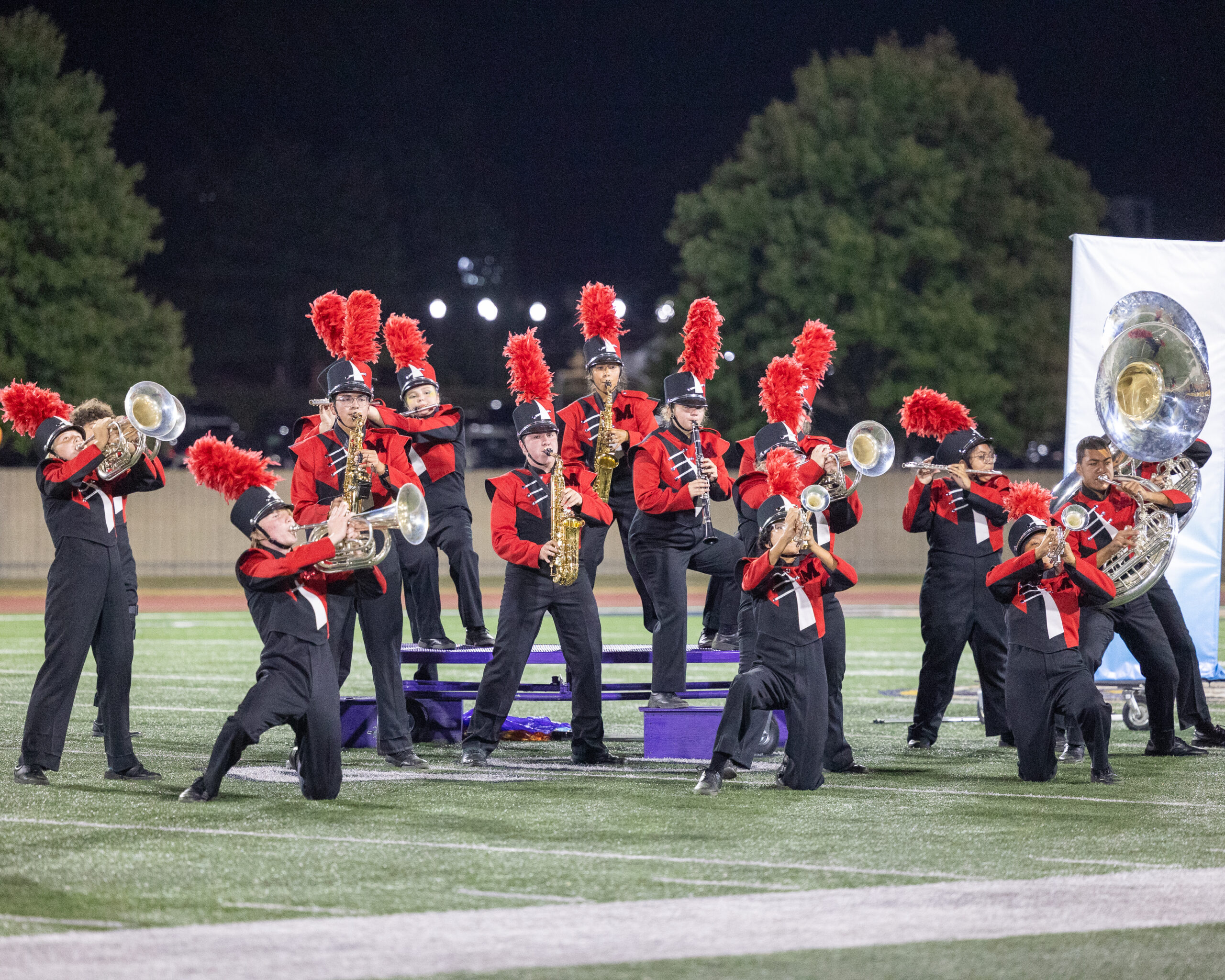 As the players hit their final notes, the guard stands with their flags at their sides, and the band gathers in a corner nearest the stands, leaning toward the audience. No instruments can be heard lingering after the release—a clean cut off.